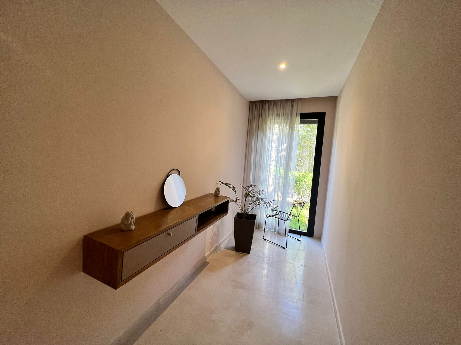 Une suite avec salle de bain, une cuisine américaine bien équipée, un espace salon donnant sur le jardin , rangement et espace bureau .